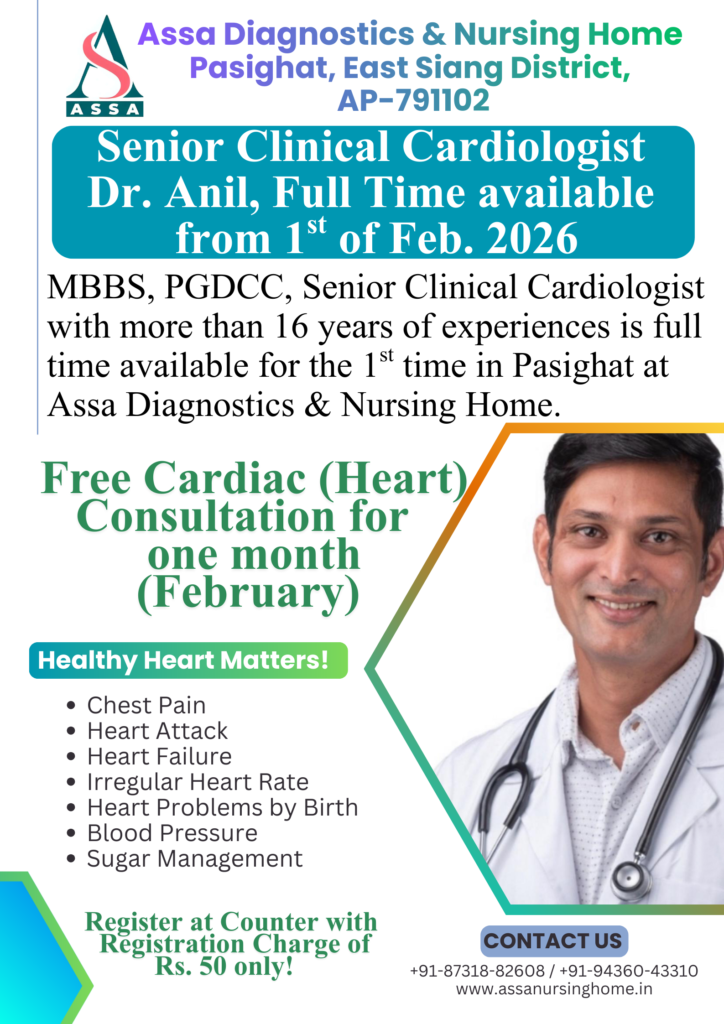 Assa Diagnostics & Nursing Home is proud to welcome Dr. Anil (MBBS, PGDCC) to our permanent medical team in Pasighat. With a distinguished career spanning over 16 years, Dr. Anil brings expert-level cardiac care to the East Siang District.