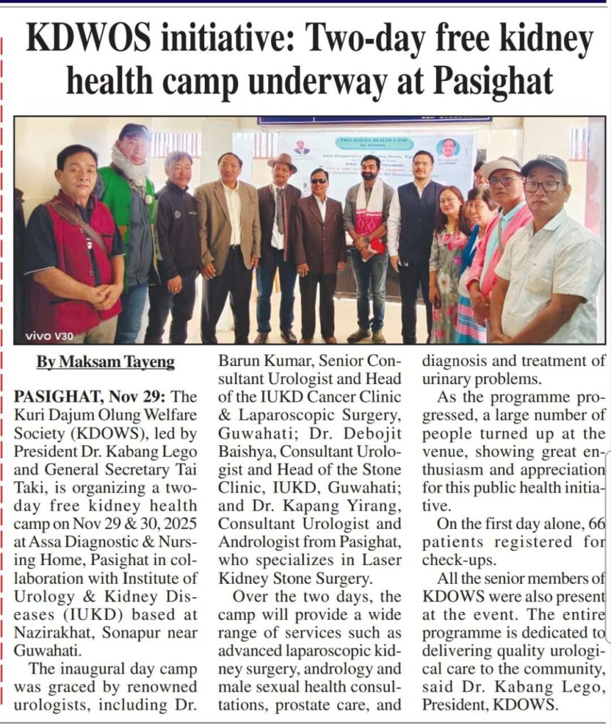 The Kuri Dajum Olo Welfare Society (KDOWS), led by President Dr. Kabang Lego and General Secretary Tai Taki, organized a impactful two-day free kidney health camp in Pasighat. In collaboration with the Institute of Urology & Kidney Diseases (IUKD), the camp provided advanced services like laparoscopic kidney surgery consultation, andrology, and prostate care by renowned urologists. Over 66 patients registered for check-ups on the first day alone, demonstrating the community’s great appreciation for this public health initiative.